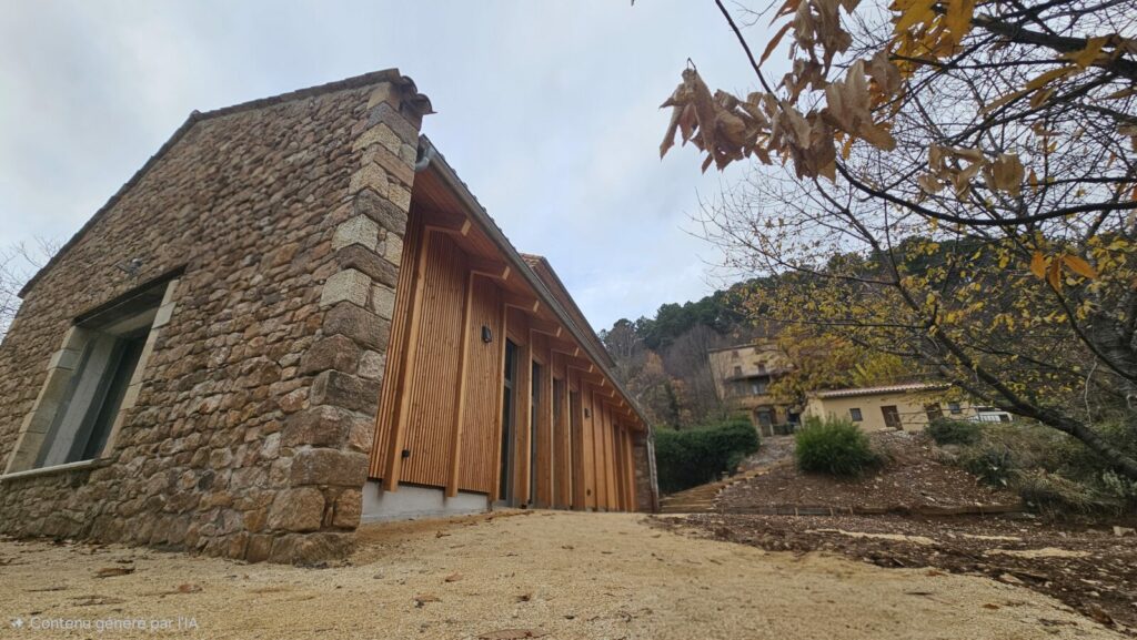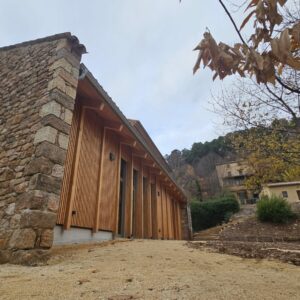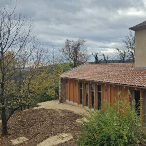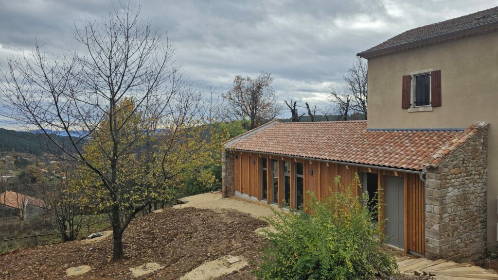 • Charpente en bois massif et lamellé collé avec couverture en tuiles,