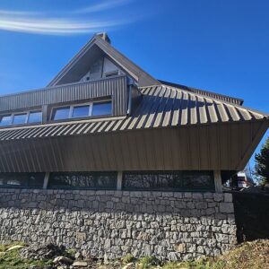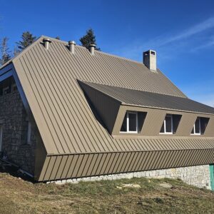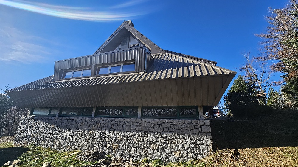 Toiture d’un chalet à la Croix de Bauzon: charpente en lamellé collé et bois massif avec près de 500m² de couverture en bac acier