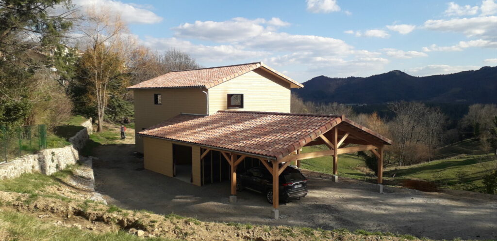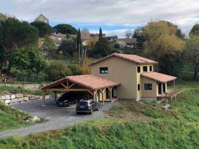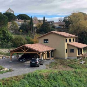 Construction d’une maison à étage, en ossature bois. Isolation en fibre de bois et bardage extérieur en CEDRAL. Charpente traditionnelle, couverture tuiles, menuiseries en aluminium.