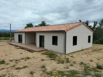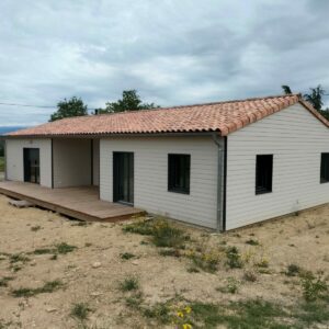 Construction d’une maison en ossature bois de 111m² avec un garage accolé de 24m² et une terrasse bois de 40m². Les murs ossature bois sont isolés en laine de verre et fibre de bois. La charpente est en fermettes avec une isolation en laine de verre soufflée, couverture en tuile. Maison livrée clé en main.